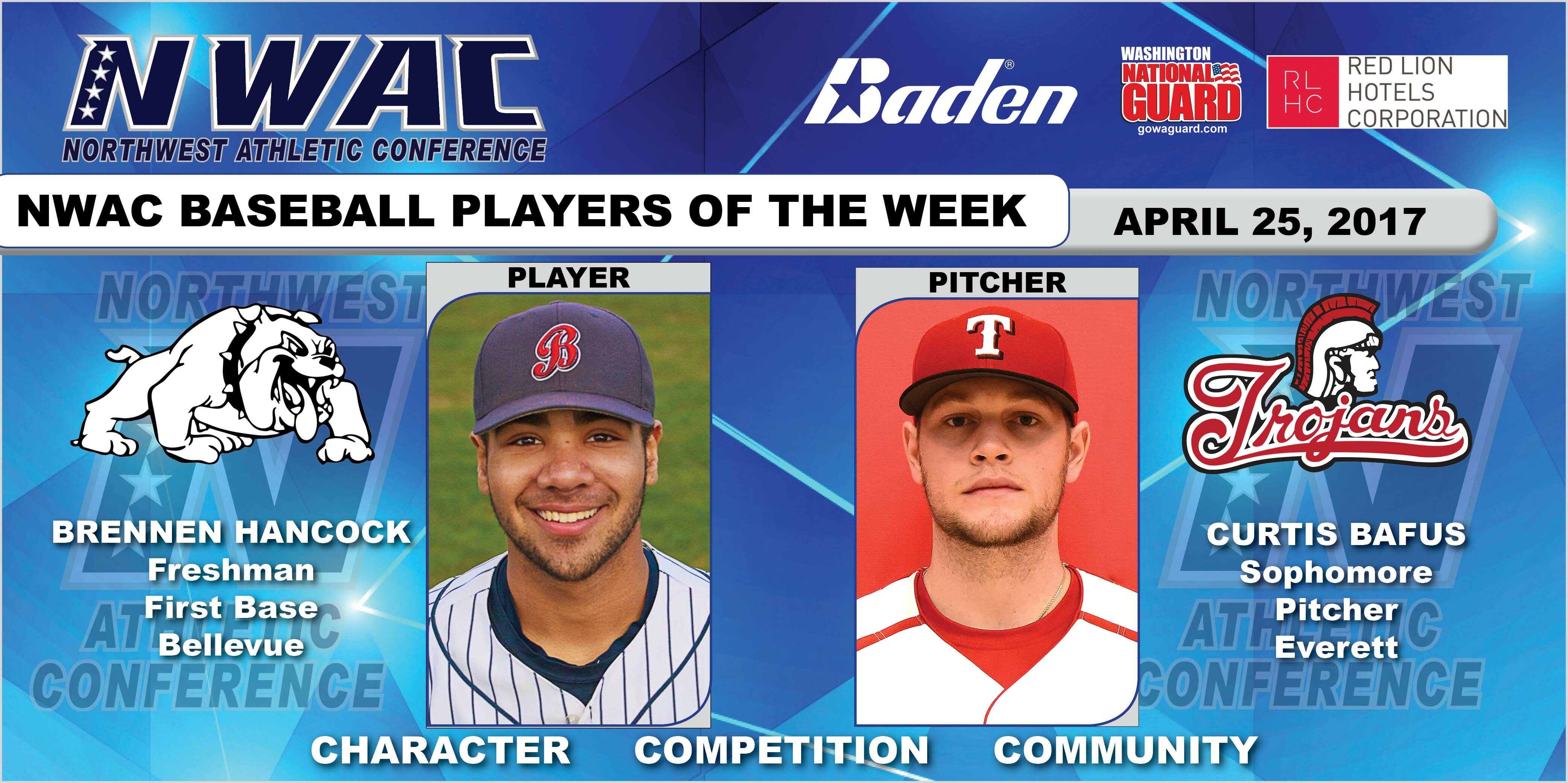 Bellevue freshman Brennen Hancock, Cascade HS / Everett, WA, was named Player of the Week. In four games last week, he went 9 of 15 at the plate for a .600 BA, including 4 doubles, 2 home runs and collected 9 RBIs to go with the 4 runs he scored.